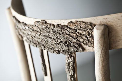 Les designers italiens Andrea Magnani, Giovanni Delvecchio et Elisabetta Amatori du studio de creation Resign ont imaginé Di Corte, une série de chaises en bois dont certaines parties sont encore recouvertes d’écorce, comme une retour de l’objet à ses racines.