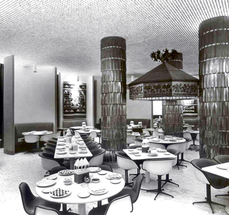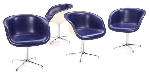Du design du restaurant « La Fonda del Sol », Alexander Girard aura tout conçu à l’exception des sièges pour lesquels il se donc tournera naturellement vers ses amis Charles & Ray Eames. Le prérequis : concevoir des sièges dont le dossier ne doit pas s’élever au dessus de la table pour donner une impression d’horizontalité sans interruption. Tandis que les coques en fibre de verre reprennent clairement le langage formel des chaises déjà créées par le couple Eames, le piètement central en aluminium est un élément entièrement nouveau dans l’élaboration des sièges Eames. Editions Vitra, sièges recouverts de cuir crème, tout simplement magnifiques.