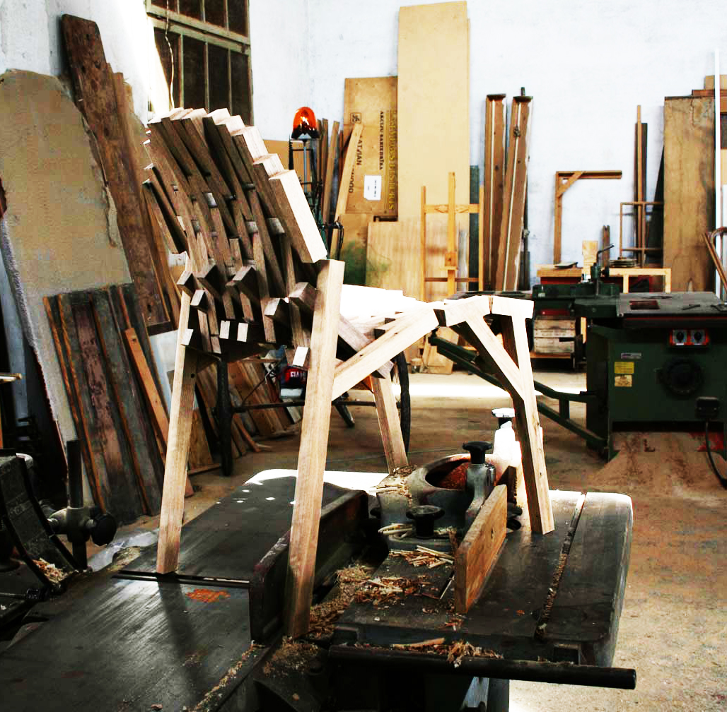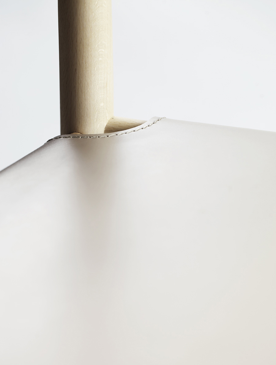 Cela permet d’optimiser le matériel pour y parvenir parce que vous commencez avec un des pôles constants ronds de diamètre qui peut facilement être produits avec des machines standard donc la chaise est une structure en pièces de bois tournées sur laquelle est tendue une assise de cuir.