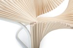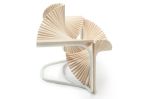 Curvy Chair semble toujours en mouvement par sa structure de métal blanc qui soutient une série de bâtonnets en bois de section ronde disposés en éventail.