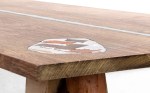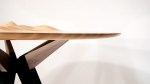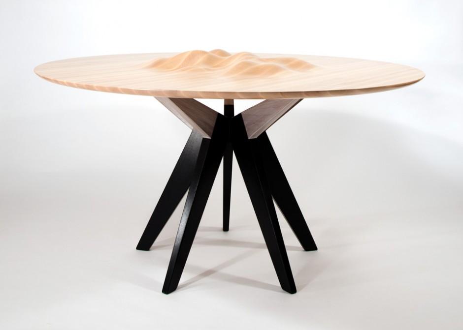 The ‘Ocean’s Edge’ dining table is part of an ongoing body of work utilizing a CNC router to digitally sculpt oceanic waveforms moving across planar wood surfaces. The undulating surface that rises out of and dips into the center of the table was developed in CAD by ‘lofting’ a sequence of tide curves sourced from the entrance of the San Francisco Bay.