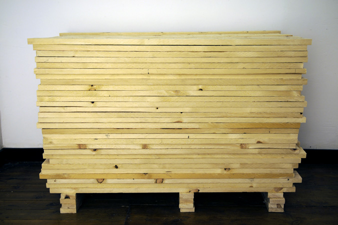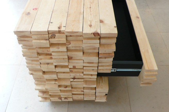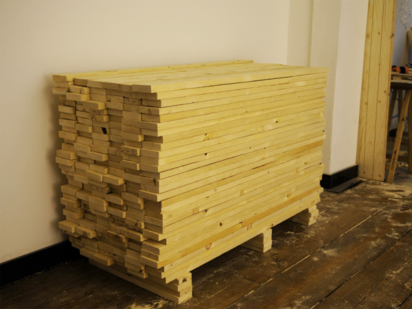 Chaque année a lieu une exposition nommée « New Harvest » à la galerie de design Vlaanderen, dont la vocation est de stimuler le design belge et les designers belges. 25 designers ont ainsi été sélectionnés l’année dernière pour présenter cette année une exposition collective. C’est à cette occasion que Raphaël Charles a dévoilé une commode au nom mystérieux : « Ordinary day in a wood factory » (un jour ordinaire dans une usine de bois). La commode est quelque peu conceptuelle, puisqu’il s’agit d’un simple amas de planches de bois, le genre d’amas qui doit être effectivement le pain quotidien d’une usine de bois. Pour les amateurs de design conceptuel et avant-gardiste.