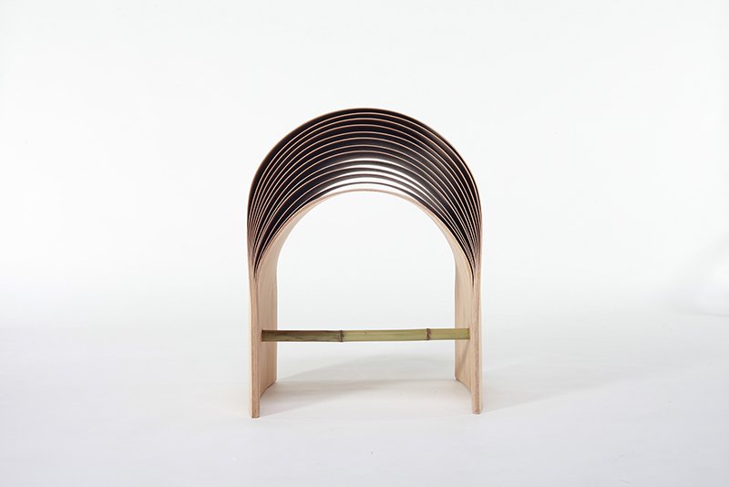 Each bamboo veneer is different in length. They are bent in an arc shape and glued together at the last 25cm of each end. There is one piece of raw bamboo stick that penetrates in the veneers and combines the two ends of the stool.