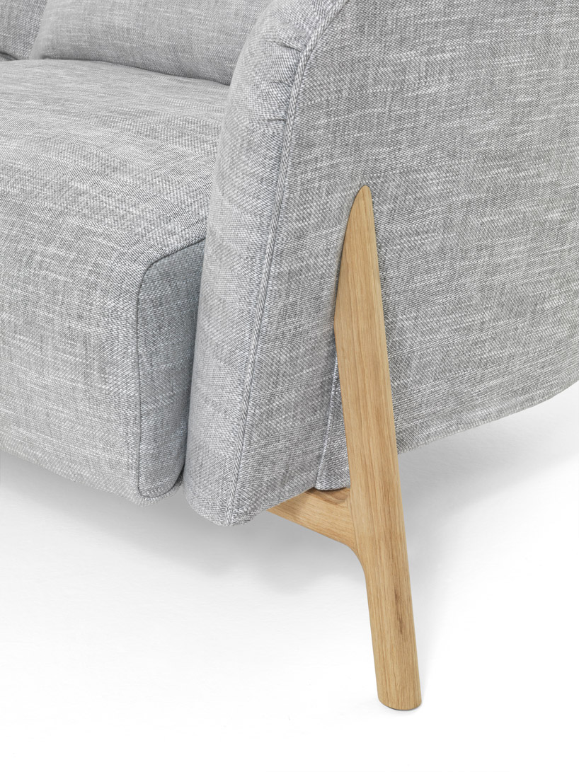 La conception est réalisée avec cinq pieds réglables qui gravitent autour du canapé rembourré comme l’échafaudage d’une construction, la nature stable de la base en chêne naturel ou noir contraste avec la douceur des lignes du canapé, fabriqué à partir de duvet d’oie avec support en mousse de polyuréthane qui est couverts d’un tissu orange ou  gris en coton amovible. La structure arrière est en acier et une mousse de polyuréthane moulée doublé de polyester.
