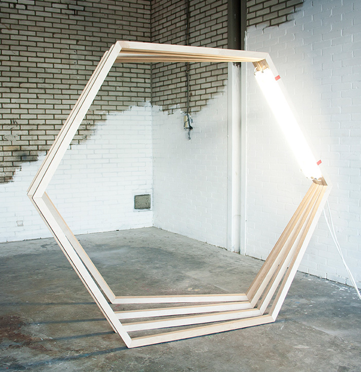 Nouvelle approche se situe à l’intersection de l’art et de l’architecture, la création d’une conversation enjouée entre l’expérience utilisateur, la lumière et l’espace. Jorge Serrano PENADES combine des éléments simples dans la construction pour créer une illusion de complexité. Une série de quatre à six pans cadres en bois sont disposées et orientées dans une marge en forme d’éventail, de leur point de tangence commun au figuré illuminée par une bande lumineuse de la lumière.