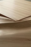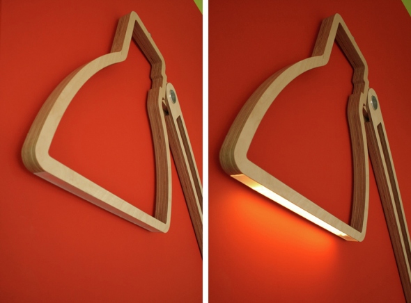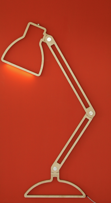 Family of lamps made from a single bent plywood sheet (also available in aluminium), with a wooden base acting as a counterbalance. Made in the designer’s own workshop using the technique of woodbending.