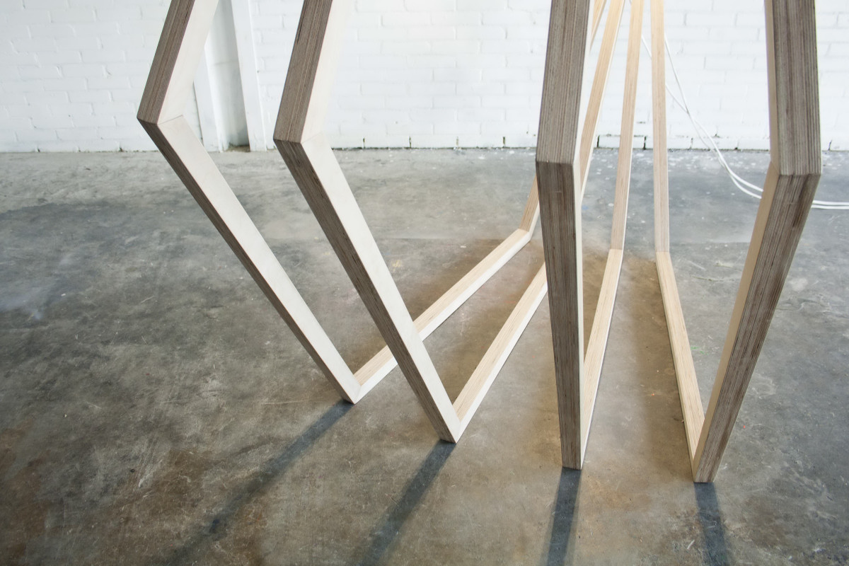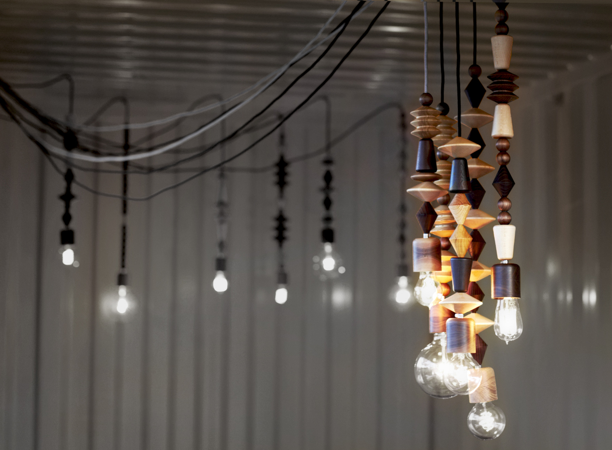 The concept was developed in conjunction with How We Create (the design showcasing business) and launched at Saturday Indesign last year, where we demonstrated the relationship between designer and manufacturer. The turned timber beads were made on the day, using a lathe so everyone could witness first-hand the process by which they were made.