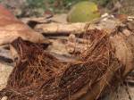The outside of our bag is made of fibre from coconut husks pressed together with a bit of natural resin. These fibres are very strong and water resistant.